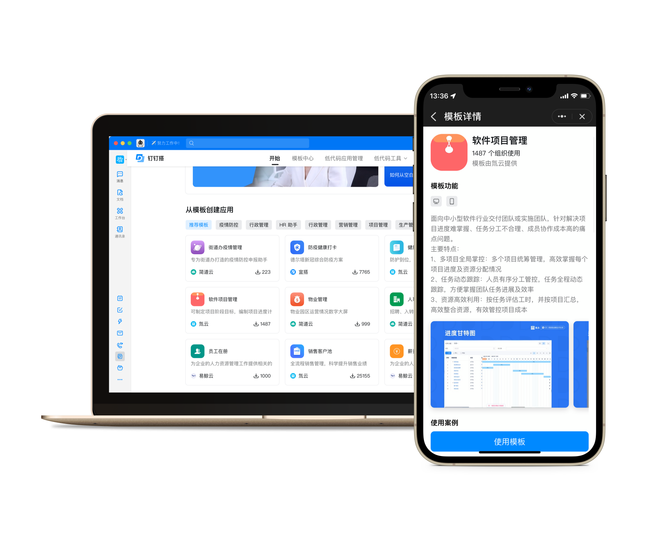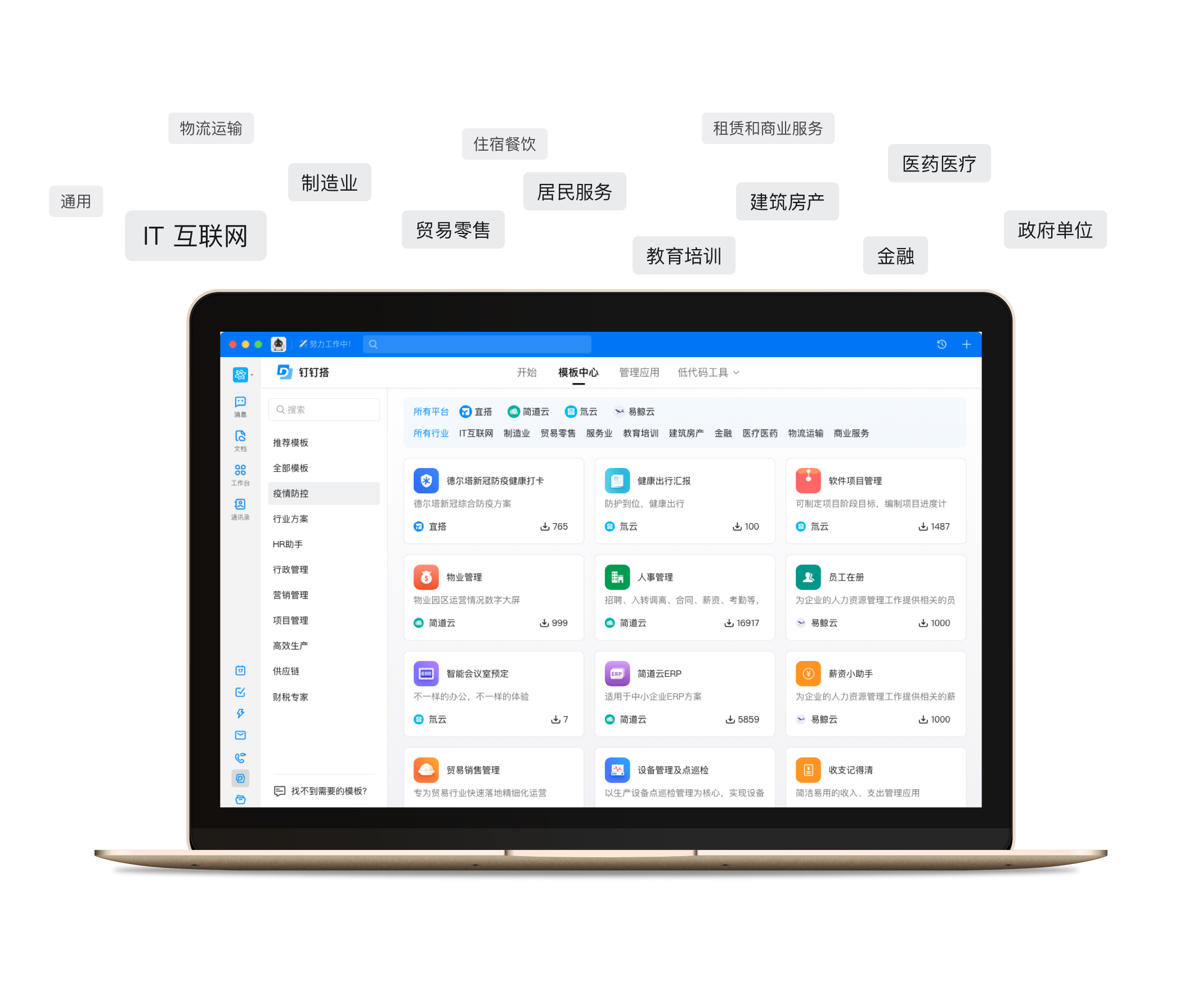 宜搭、氚云、簡道云、易鯨云等頭部低代碼廠商入駐,支持用拖拉拽的方式,像搭積木一樣搭建應用,簡單快捷。