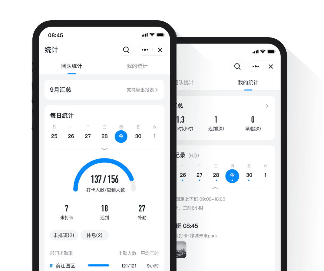 老板隨時了解團隊狀態出差在外,通過手機統計,也能隨時了解團隊狀態,遲到加班一目了然。